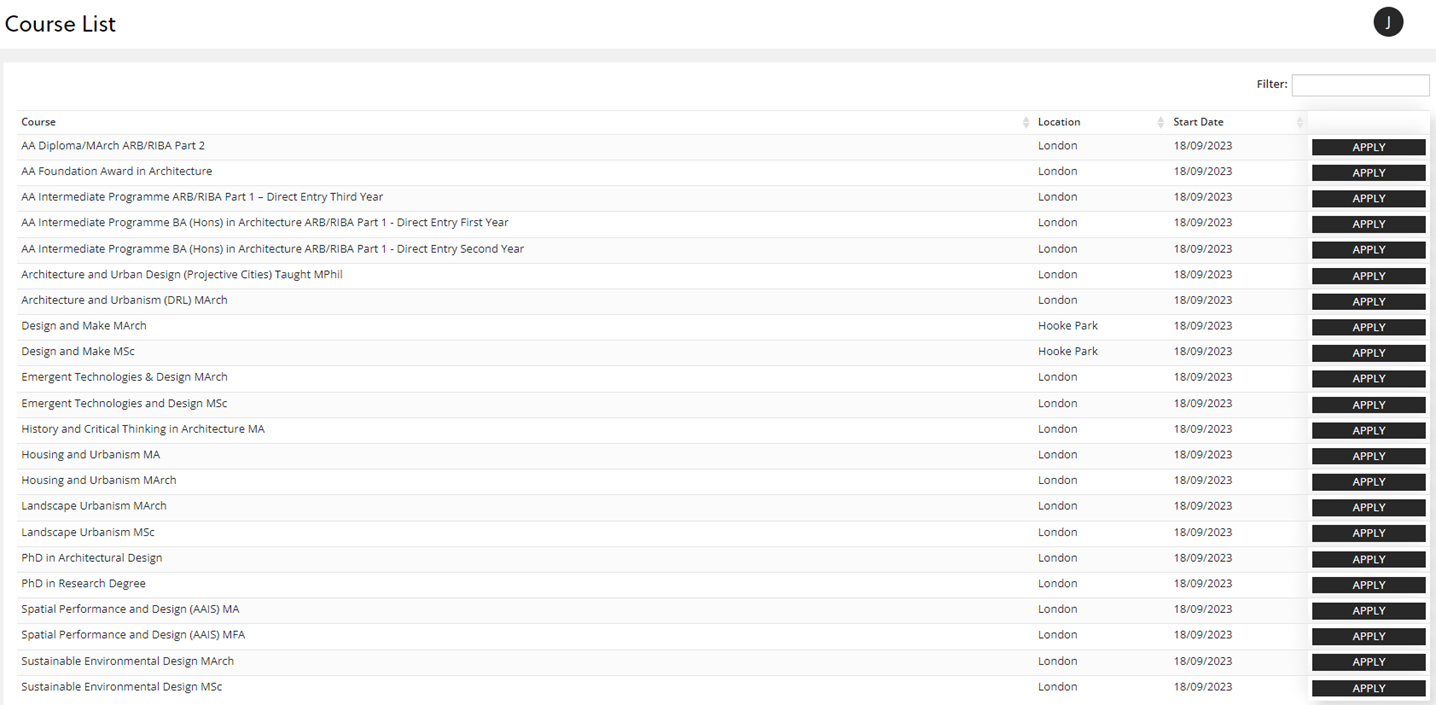 You will be taken to the following screen with a list of AA programmes. Click the 'APPLY' button next to the programme you wish to apply for: