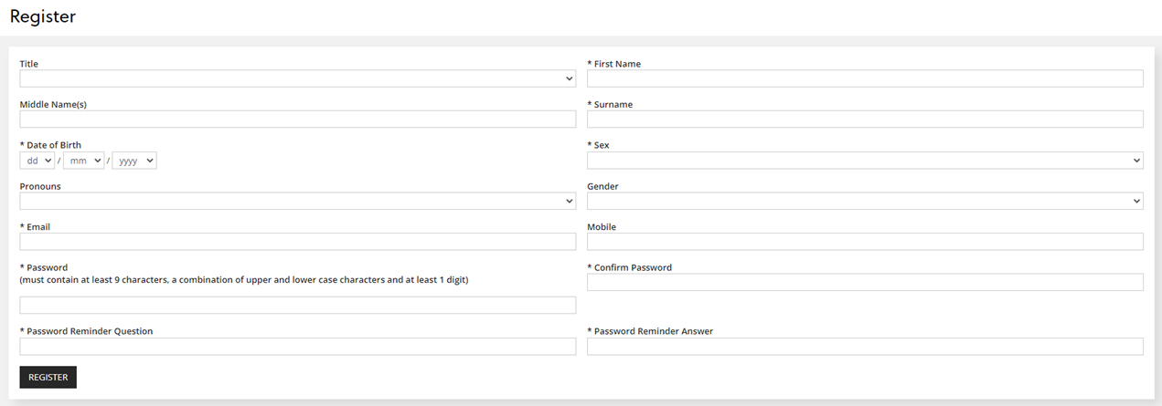 Complete the details in the form and click 'REGISTER' to create your account: