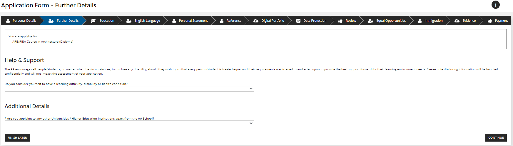 Answer the questions on this page regarding additional Help & Support you might require for your studies, and whether you are applying to any other institutions or Universities.