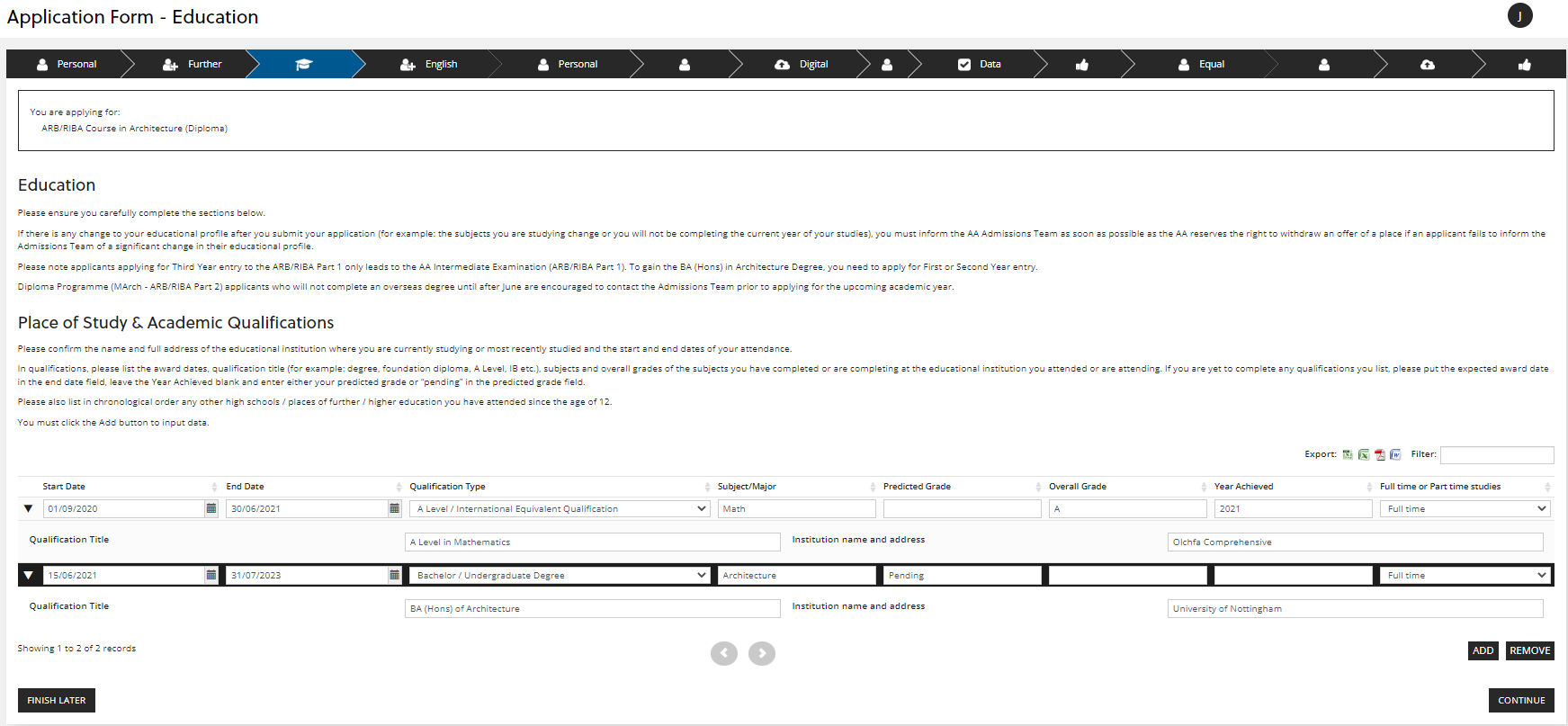 In this section you will be asked to list your education history, including the qualifications which meet the entry requirements for the programme you are applying for.
