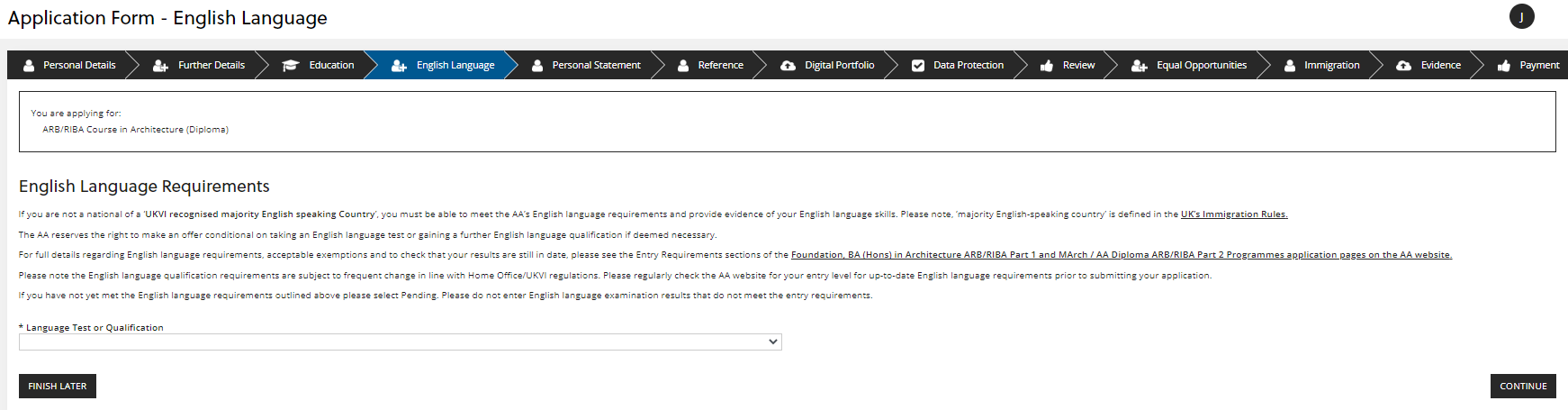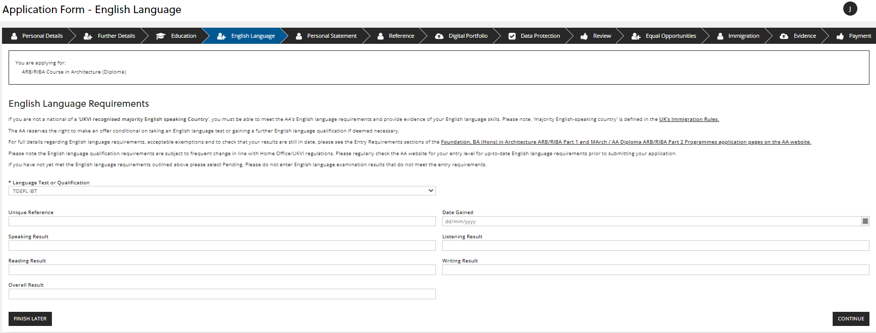 In this section you can enter how you meet the English Language requirements for the programme you are applying for. If you have not received or booked your English language test yet, please select 'Pending' from the drop-down menu and you can upload your English Language test results later.
