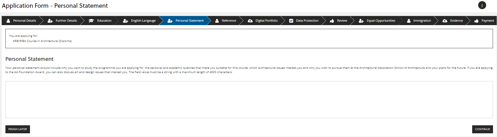 For Foundation, Intermediate and Diploma programme applications the word limit is 500 words and there is a box to write or copy and paste your personal statement into. You can click 'FINISH LATER' if you have not prepared your personal statement yet. Once filled in, click 'CONTINUE':