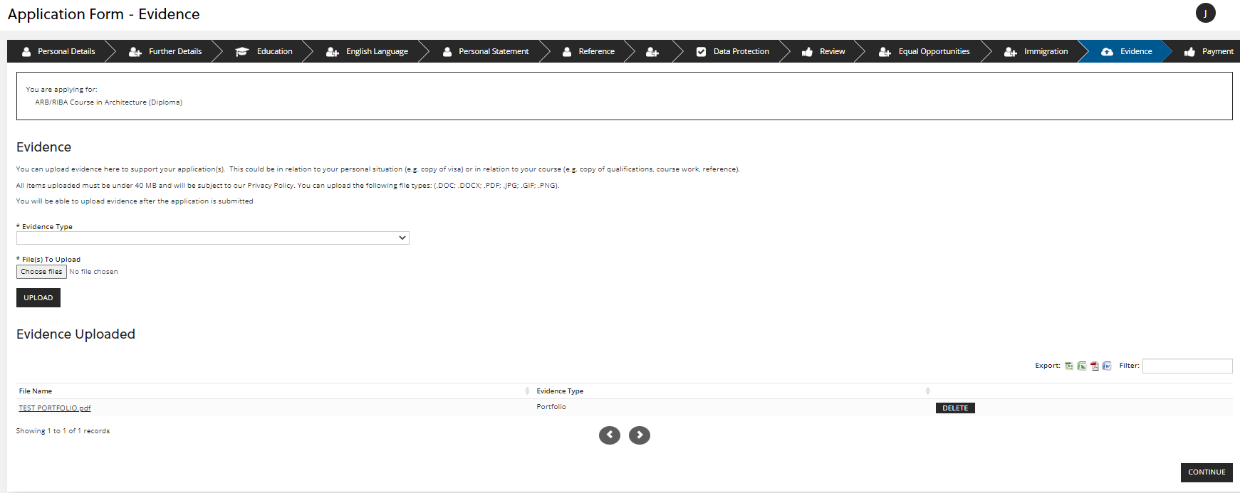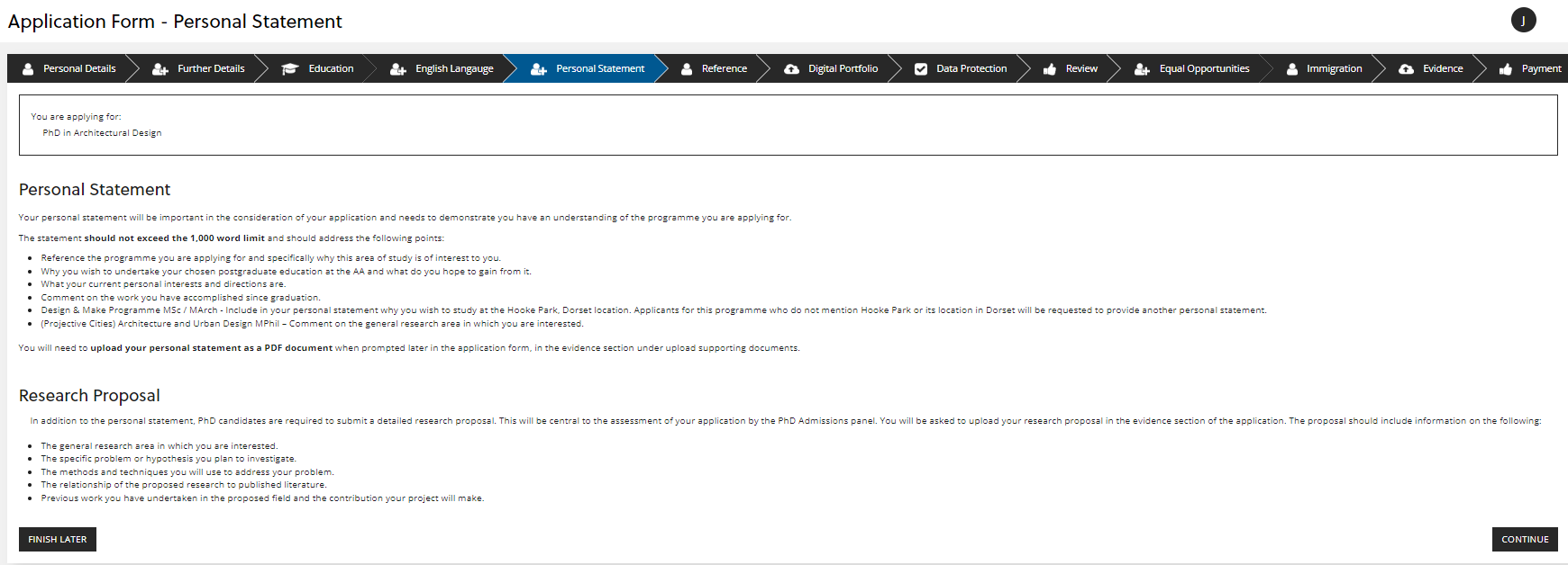 For Taught Postgraduate and PhD Programme applications the word limit is 1,000 words and you will need to upload the personal statement as a PDF in the evidence section. Click 'CONTINUE' to the next section: