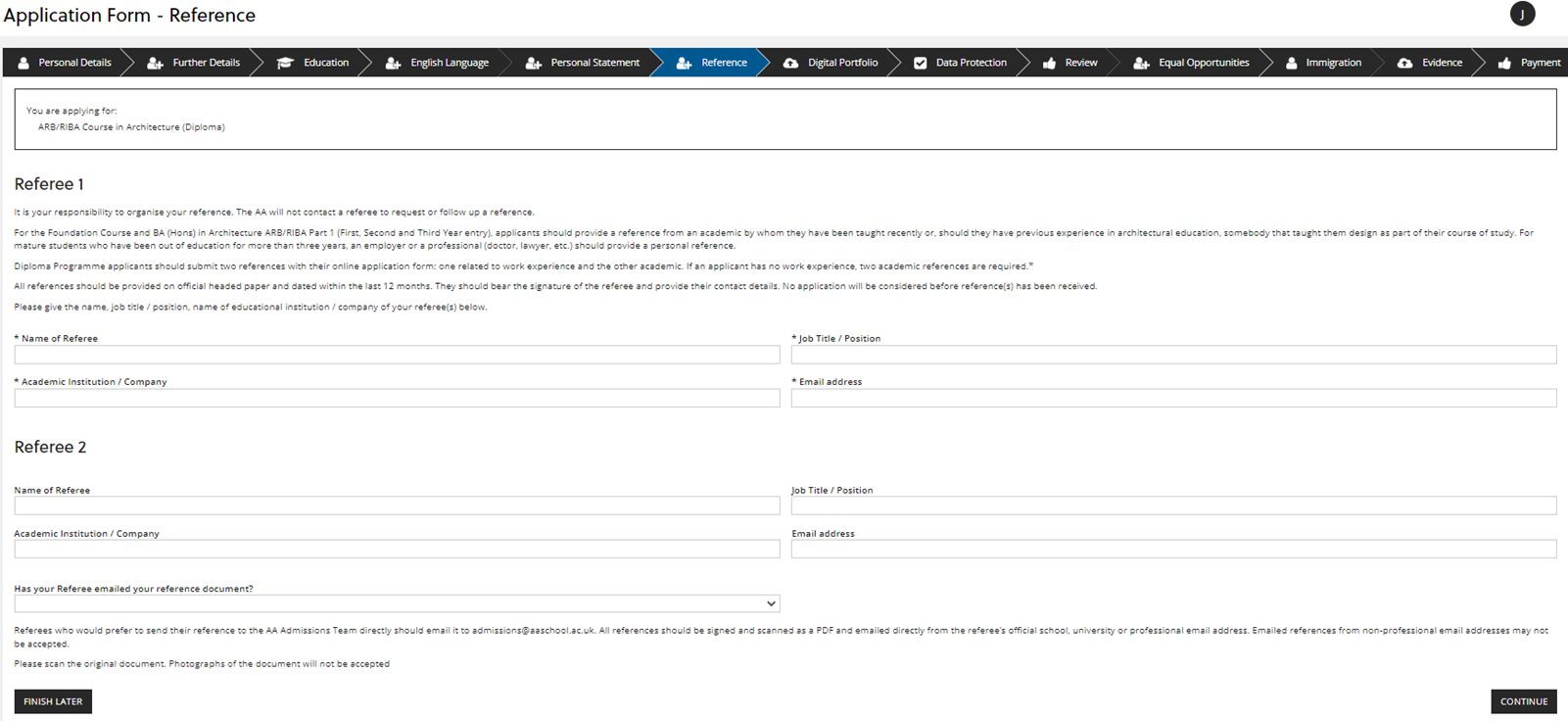 For Foundation Course and Intermediate Programme applications, you need to provide one reference from an Academic Referee.