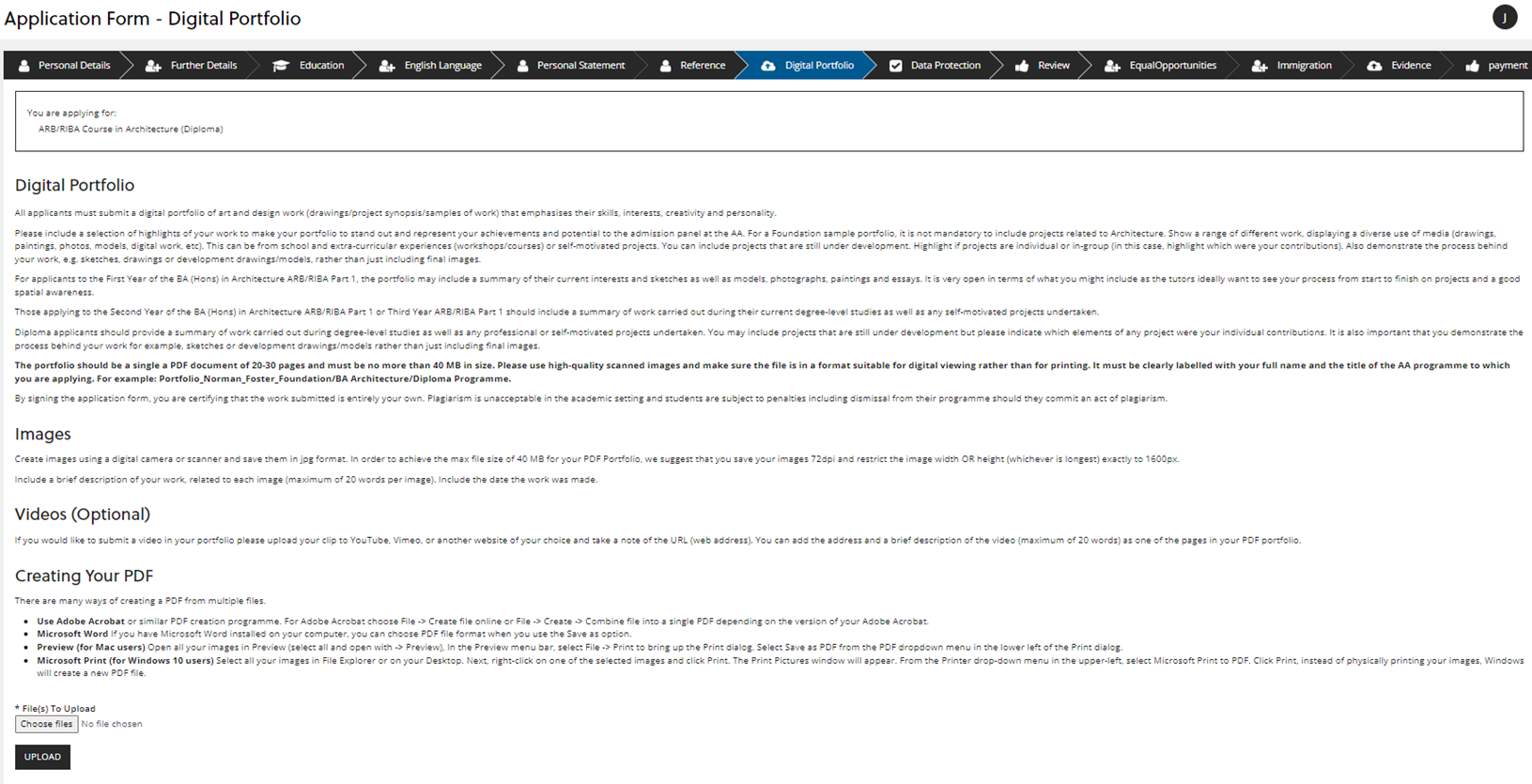 The next section requires you to upload your digital portfolio. The portfolio should be a single PDF document of 20-30 pages and must be no more than 40 MB in size. Please use high-quality scanned images and make sure the file is in a format suitable for digital viewing rather than for printing. It must be clearly labelled with your full name and the title of the AA programme to which you are applying. Eg: Portfolio_Firstname_Surname_DiplomaProgramme.