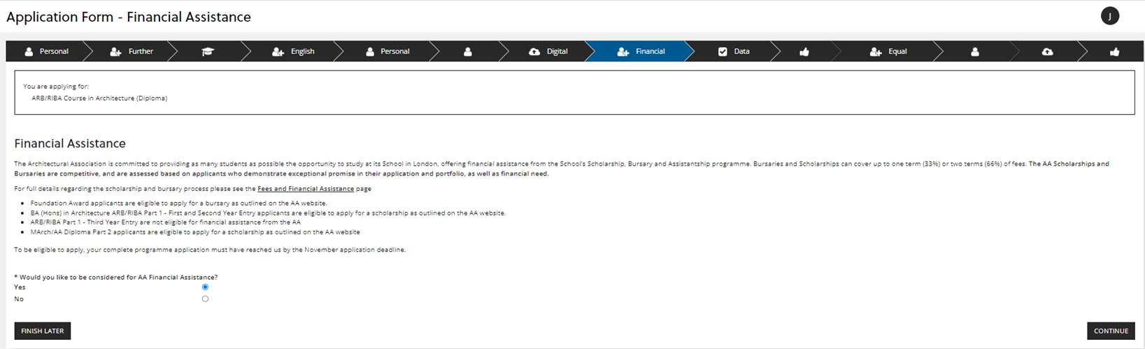 The next section asks if you wish to be considered for AA Financial Assistance, which is only available if you are applying by the early application deadline for your programme. Check the relevant admissions page on the main AA website, under the 'Deadlines and Open Days' section: https://www.aaschool.ac.uk/admissions
