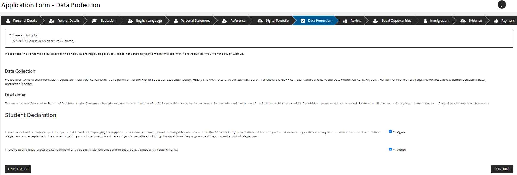 Read and tick the boxes in this section to agree to the student declaration. Then click 'CONTINUE':