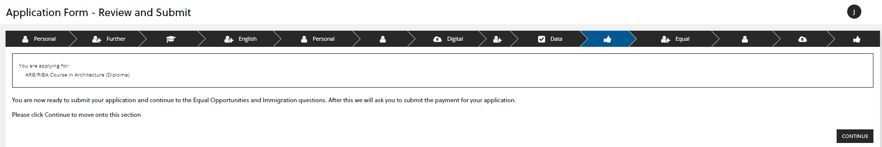When you are ready to submit the first part of the application form, click 'CONTINUE' on the 'Review and Submit' page.