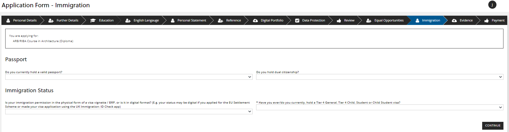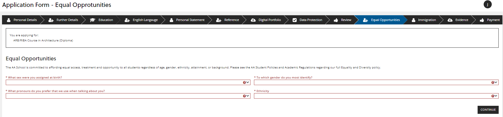 The next section asks you to answer a set of questions relating to equal opportunities. Once complete, click 'CONTINUE':