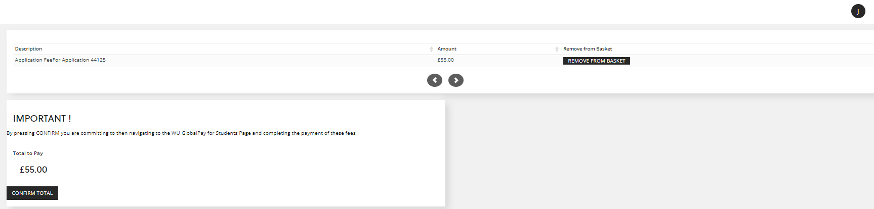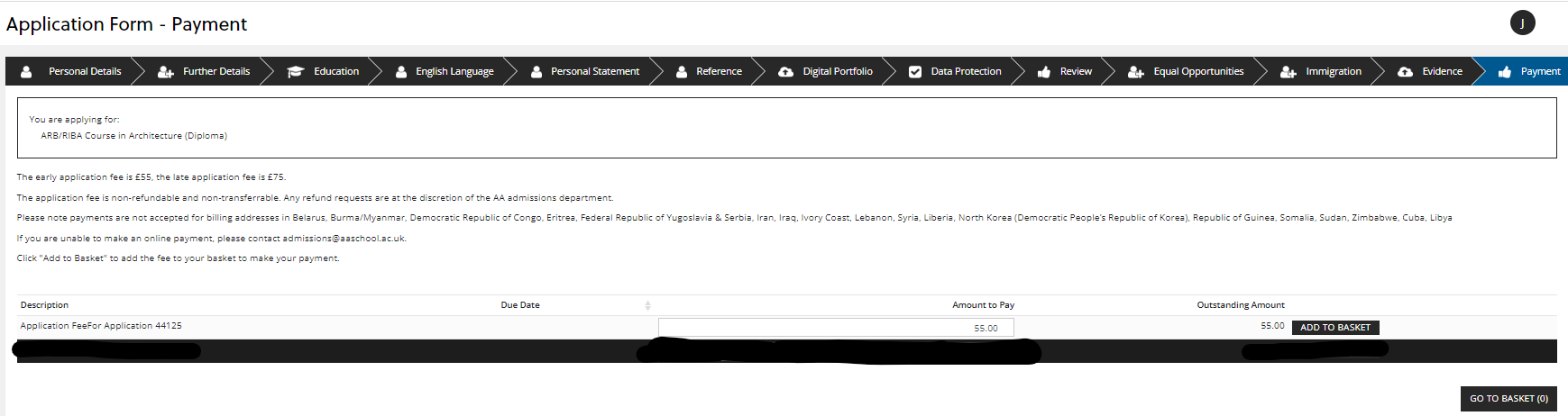 This is the final section of the application form, at which you are required to pay the application fee, which completes the application process. Click 'ADD TO BASKET' to add the application fee and then click 'GO TO BASKET':